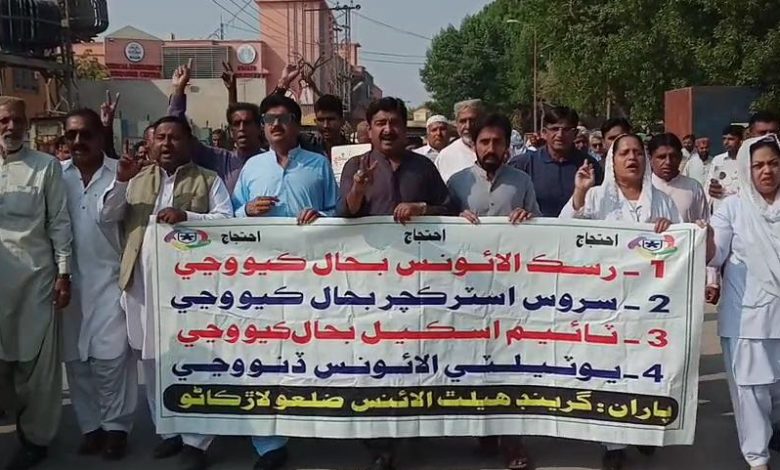 گرينڊ الائنس جي سڏ تي پيرا ميڊيڪل عملي، نرسن ۽ ليڊي هيلٿ ورڪرن سرڪاري اسپتالن جي او پي ڊيز جو بائيڪاٽ ڪري احتجاجي مظاهرا ڪري ڌرڻا هنيا. ان سلسلي ۾ حيدرآباد سول اسپتال، پريٽ آباد، شاهه ڀٽائي ۽ قاسم آباد تعلقي سميت ٻين سرڪاري اسپتالن ۾ ڪاروهنوار بند رهيو. جڏهن ته پيراميڊيڪس، نرسز ۽ عملي عبدالمجيد جتوئي، گلناز، روي تنبولي، ڊاڪٽر روشن چانڊيو ۽ ٻين اسپتالن ۾ مظاهرا ڪري ڌرڻا هنيا. ٿرڙي محبت ويجهو ڳوٺ عثمان ڪلهوڙو ۾ بيسڪ هليٿ سينٽر جي ليڊي هليٿ ورڪرن عابده سرگاڻي، شهربانو، تسليم جوڻيجو، نورالنساءِ، دلشاد، نجمان حور، سلمى، وحيدان ۽ ٻين اسپتال کي تالا لڳائي ڪم ڇڏ هڙتال ڪندي احتجاجي مظاهرو ڪيو. رتوديرو ۾ ليڊي هيلٿ ورڪرن شاهدا ميراڻي، ساجدا ميراڻي، شاهينه ابڙو، منور سومرو، سميرا ابڙو، رضيه ميراڻي، شازيه شيخ، ساجدا ميمڻ ۽ ٻين جي اڳواڻي ۾ پريس ڪلب اڳيان احتجاجي مظاهرو ڪيو ويو. روهڙي ۾ ڊاڪٽرن ۽ پيراميڊيڪل عملي تعلقي اسپتال روهڙي ۾ او پي ڊي جو بائيڪاٽ ڪري تالابندي احتجاجي مظاهرو ڪيو. ٽنڊو آدم ۾ ڊاڪٽرز، پيرا ميڊيڪل ۽ نرسنگ اسٽاف تعلقي اسپتال ۾ او پي ڊيز جو بائيڪاٽ ڪري محمد مٺل پڃارو، مبارڪ خاصخيلي، ڪانڊيرو خان راهو، ڊاڪٽر وحيد جيلاني، نعيم اختر ڪيريو ، ڊاڪٽر امام علي ٻگهيو ۽ ٻين جي اڳواڻي ۾ احتجاجي مظاهرو ڪيو سرهاڙي جي ڊاڪٽرن، پيرا ميڊيڪل اسٽاف ۽ ليڊي هيلٿ ورڪرن ڊاڪٽر ارشد علي ڄاريڪو، محمد اقبال، سيد ذوالفقار علي شاهه، ڪامريڊ علي حسن مشوري او پي ڊي جو بائيڪاٽ ڪري اسپتال جي مک گيٽ آڏو احتجاجي مظاهرو ڪيو. خيرپور ۾ ڊاڪٽرن، پيرا ميڊيڪل اسٽاف رسڪ الائونس ۽ ڪراچي ۾ نرسنگ ۽ ڊاڪٽرن مٿان پوليس تشدد واري واقعي خلاف سٽي اسپتال خيرپور کان پريس ڪلب خيرپور تائين احتجاجي ريلي ڪڍي مظاهرو ڪيو. سول اسپتال مڪلي ۾ حاجي اشرف خشڪ، عبدالڪريم ڀاند، حاجي اسد خشڪ، بابو ھدايت الله فاضلاڻي، حاجي ابراھيم سميجو، منظور چانڊيو، معشوق پنھور، لياقت عباسي، انور جاکرو، علي ڏنو خاصخيلي، عطا ناريجو، بچل پنھور، لاھوتي گڊو خشڪ، اصغر جاکرو جي اڳواڻي ۾ احتجاج ڪيو ويو. ٽنڊو غلام علي اسپتال ۾ ڊاڪٽر مظھر ڀرڳڙي، محمد صالح باگراڻي، رياض قادري، علي غلام جلالاڻي، نورجهان چانڊيو ۽ مهرالنساءُ او پي ڊي بند ڪري ريلي ڪڍي پريس ڪلب آڏو مظاھرو ڪيو. لاڙڪاڻي ۾ ليڊي هيلٿ ورڪرن سول اسپتال، چانڊڪا اسپتال، شيخ زيد چلڊرين اسپتال ۽ شيخ زيد وومين اسپتالن جي او پي ڊيز سميت ليباريٽري، ايڪسري، الٽراسائونڊ، آپريشن ٿئيٽر ۽ ٻين شعبن جي تالابندي ڪري اڳواڻن شاهي خان جاگيراڻي، ذوالفقار علي سهتو، قاسم جسڪاڻي، ذوالفقار سهتو، روبينه شبنم، غلام حسين جلباڻي، قيصر خان لهر، غلام حسين لانگاهه، دلمراد جاگيراڻي، ڪامل شيخ ۽ ٻين سول اسپتال کان پريس ڪلب تائين احتجاجي ريلي ڪڍي ڌرڻو هنيو. ان موقعي تي اڳواڻن چيو ته پوري سنڌ ۾ صحت کاتي جا ملازم 32 ڏينهن کان رسڪ الائونس، ٽائيم اسڪيل، سروس اسٽرڪچر ۽ يوٽيلٽي الائنس سميت ٻين مطالبن جي مڃتا لاءِ سراپا احتجاج بڻيل آهن، گذريل جمعي ڏينهن اسان جي مرڪزي اڳواڻن ڪراچيءَ ۾ ڌرڻو هنيو. هنن چيو ته روٽي، ڪپڙا ۽ مڪان جي نعري هيٺ سنڌ ۾ 14 سالن کان سنڌ ۾ پيپلز پارٽي جي حڪومت آهي جن حڪمرانن کي اسان عوام ووٽ ڏئي ڪامياب ڪرائي اقتدار جون واڳون حوالي ڪيون اڄ اهي حڪمران اسان کي پنهنجا جائز حق گهرڻ تي تشدد جو نشو بڻائي ڀت سان لڳائڻ جي ڪوشش ڪري رهيا آهن پر اسان ڊڄڻ وارا ناهيون ۽ مطالبن جي مڃتا لاءِ احتجاجي تحريڪ پوري سنڌ ۾ جاري رکنداسين.